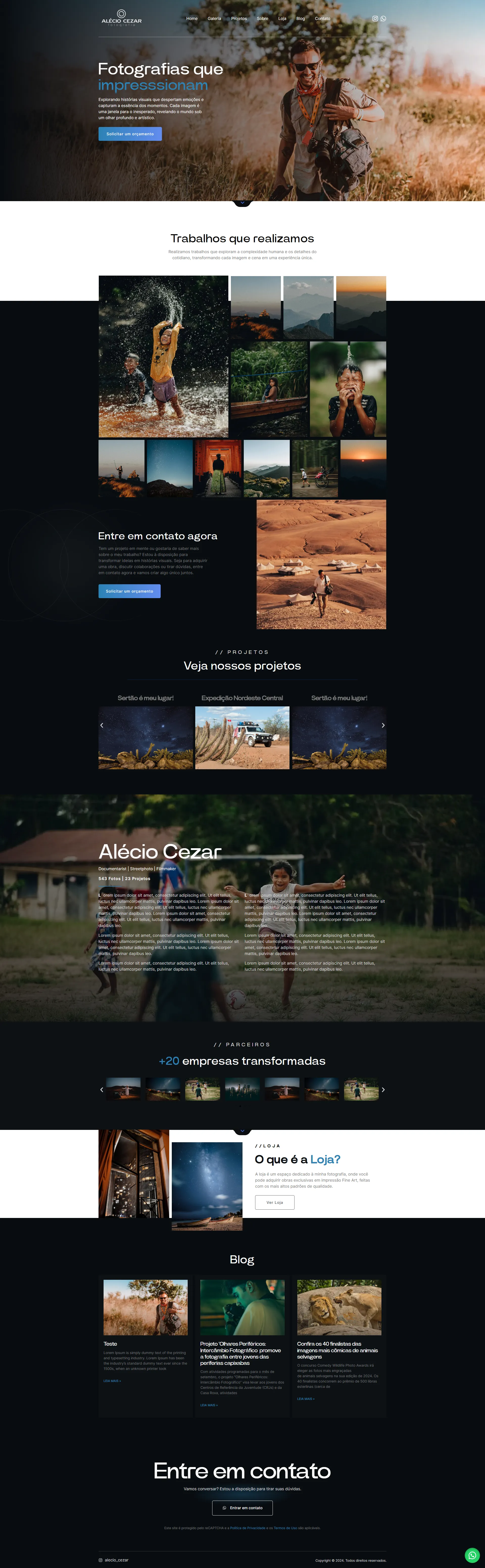 Desenvolvemos o site institucional de portfólio do fotógrafo e vídeo maker Alécio Cezar, profissional com mais de 20 anos de experiência no mercado. O objetivo do projeto foi criar um site moderna e funcional, que destacasse não apenas sua trajetória e reconhecimento na fotografia documental, no fotojornalismo e no audiovisual, mas também apresentasse seu trabalho de forma envolvente e acessível.